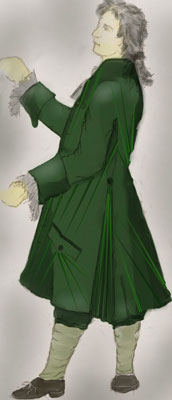 Jean le narrateur se mue en Bach, ils sont tous deux des écrivains de la Passion, donc nous les retrouvons au 18e, sous les traits de ce Bach pas très argenté, au costume fatigué, à la perruque un peu échevelée. Des plis ou des rayures seront présents sur le costume, comme pour les solistes et les chœurs, véritable leitmotiv de la création et fil conducteur à travers les âges.