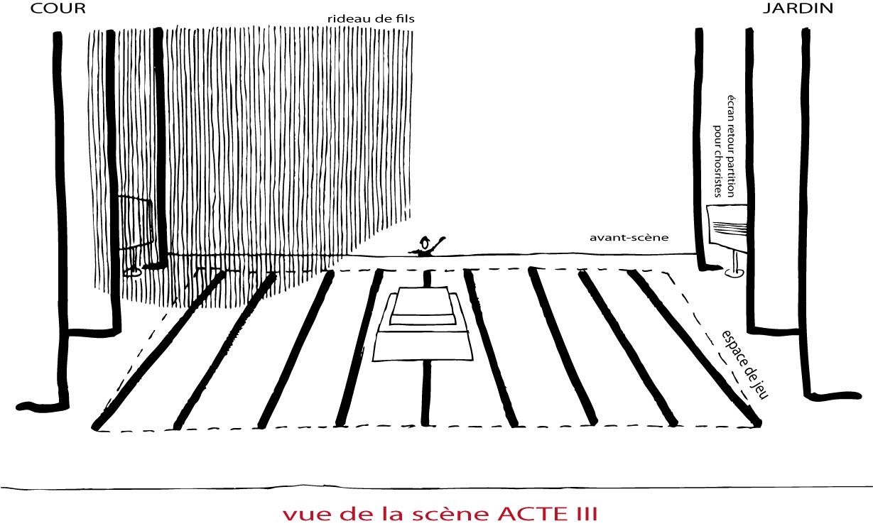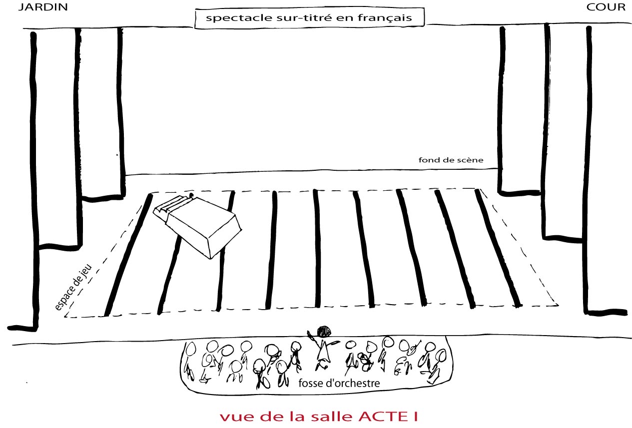 L’orchestre est dans la fosse. Pour les lieux ne disposant pas de fosse d’orchestre, celui-ci prend place en bas de scène ou sur scène, hors de la surface de jeu. Le chef est relayé par des écrans de contrôle. Pour le continuo, l’orgue positif est soit en fosse et surélevé, soit sur scène, en dehors de la surface de jeu, avec le récitant.